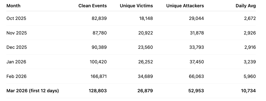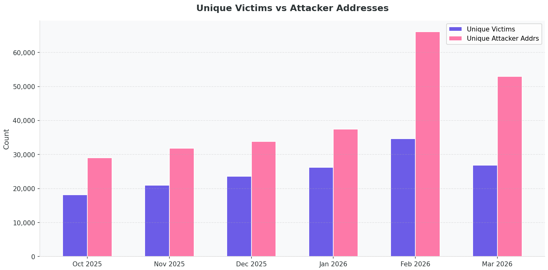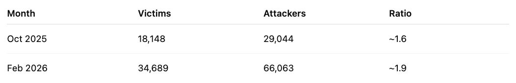 One of the more telling signals in our data is the attacker-to-victim ratio. In October 2025, there were roughly 1.6 unique attacker addresses per victim. By February 2026, that ratio had climbed to 1.9.