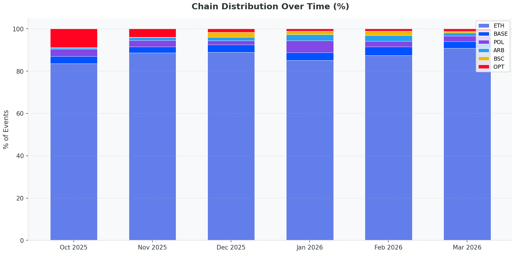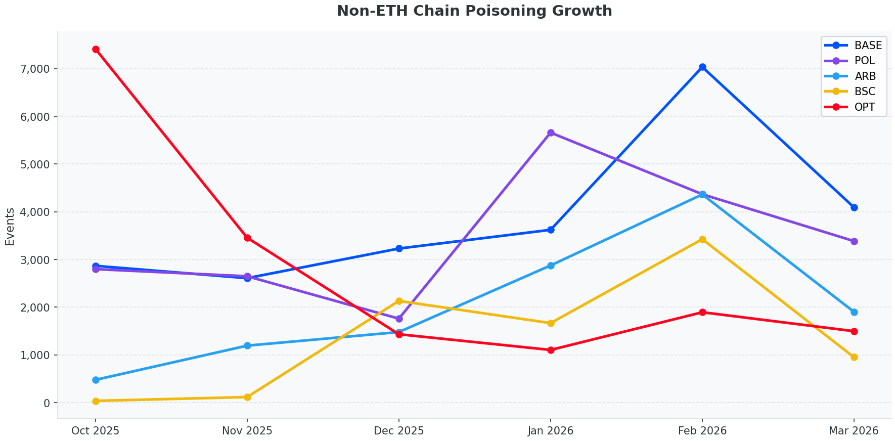 Base has become a consistent second or third most-targeted chain in our data. Arbitrum is an emerging attack surface. BSC saw a major spike in February. Optimism spiked in October before stabilizing.