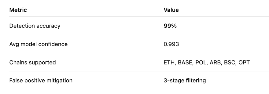 As of March 2026, the model maintains 99% detection accuracy with an average confidence score of 0.993 across ETH, Base, Polygon, Arbitrum, BSC, and Optimism.