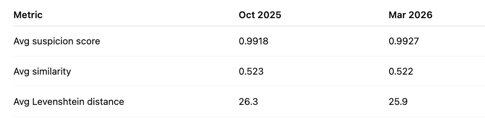 One note worth flagging: attackers are producing slightly closer address matches over time. Average Levenshtein distance dropped from 26.3 in October 2025 to 25.9 in March 2026. They're getting more precise. The model is keeping pace, but the arms race is real.