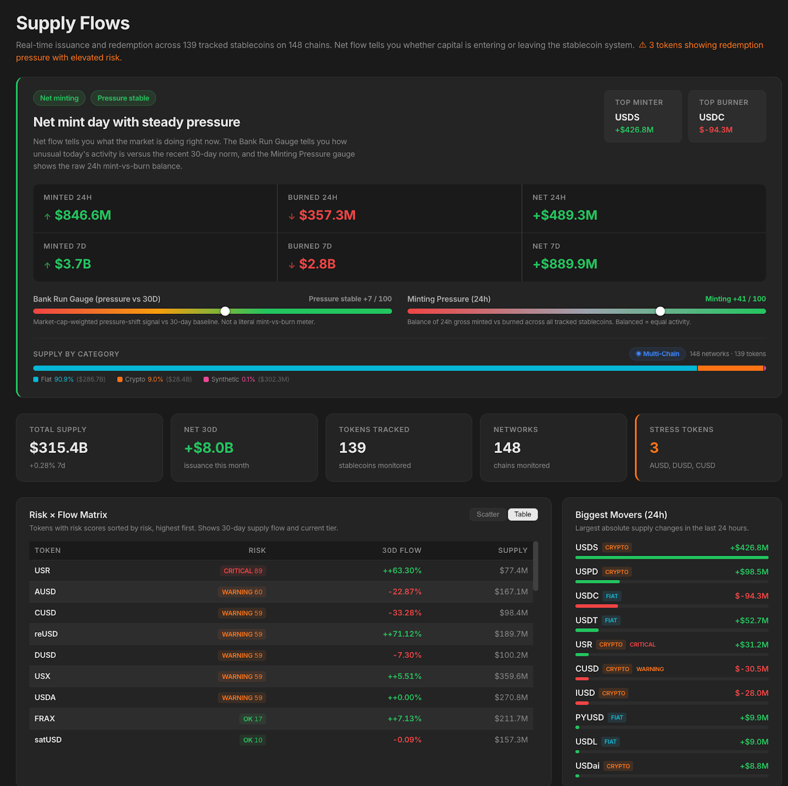 During the USR event, supply increased faster than ecosystem data sources could reflect. We now track divergence between on-chain supply and reported collateral backing. When tokens are minted faster than they can be reconciled across data sources, this gap is surfaced as an early warning signal.